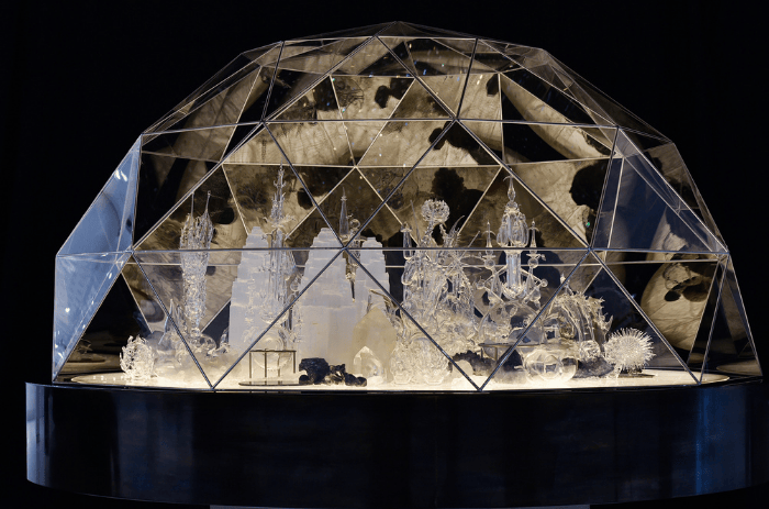 Inspiriert von der Symbolsprache von Hieronymus Bosch und der Formsprache von Buckminster Fuller präsentiert Melli Ink in ihrem Kunstwerk „City of Glass“ ihre skulpturale Sicht auf die Welt, eingefangen unter einer Glaskuppel und realisiert mit Glas, Rosenquarz und Kristall. Die Inspiration zu „City of Glass“ beginnt bei Hieronymus Bosch, dessen Arbeiten ihrer Zeit weit voraus waren und bis heute für Diskussionen in der Kunstwelt sorgen.